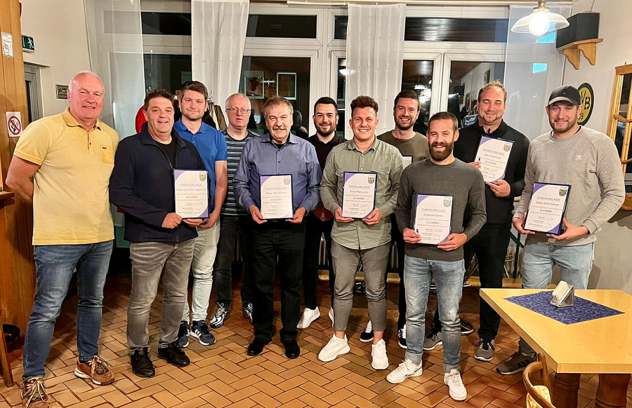 Zum Höhepunkt des Abends konnte Vorsitzender Mario Amft eine ganze Generation von Aktiven für 25-jährige Mitgliedschaft ehren. So wurden mit Patrick Amft, Lukas Gatzen, Jonas Hamacher und Jan Wickerath ausnahmslos aktive Seniorenspieler, die allesamt in der 1. und 2. Mannschaft tragende Rollen spielen und teilweise auch Vorstandsämter wahrnehmen, für treue Vereinsmitgliedschaft beglückwünscht.