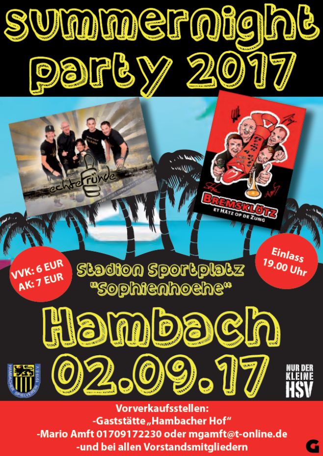 Nun ist es amtlich. Nach dem letztjährigen Erfolg der erstmalig durchgeführten Summernight-Party im "Stadion Sophienhöhe" in Hambach folgt nun die zweite Auflage. Am 02.09.2017 steigt das HSV - Event, zudem nun der Kartenvorverkauf begonnen hat.